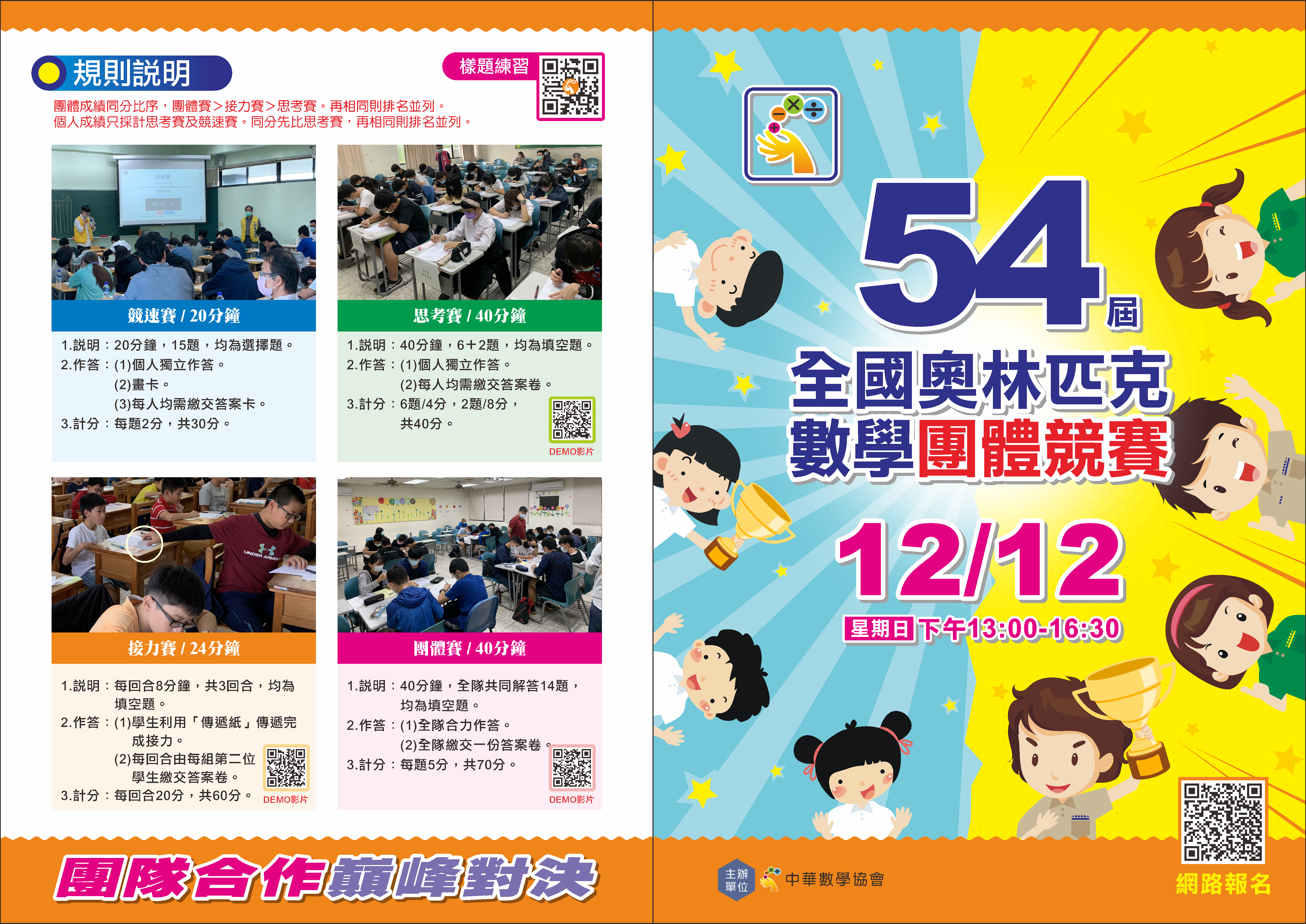 二、檢附「第54屆全國奧林匹克數學團體競賽」競賽活動簡章,供 貴校參閱。