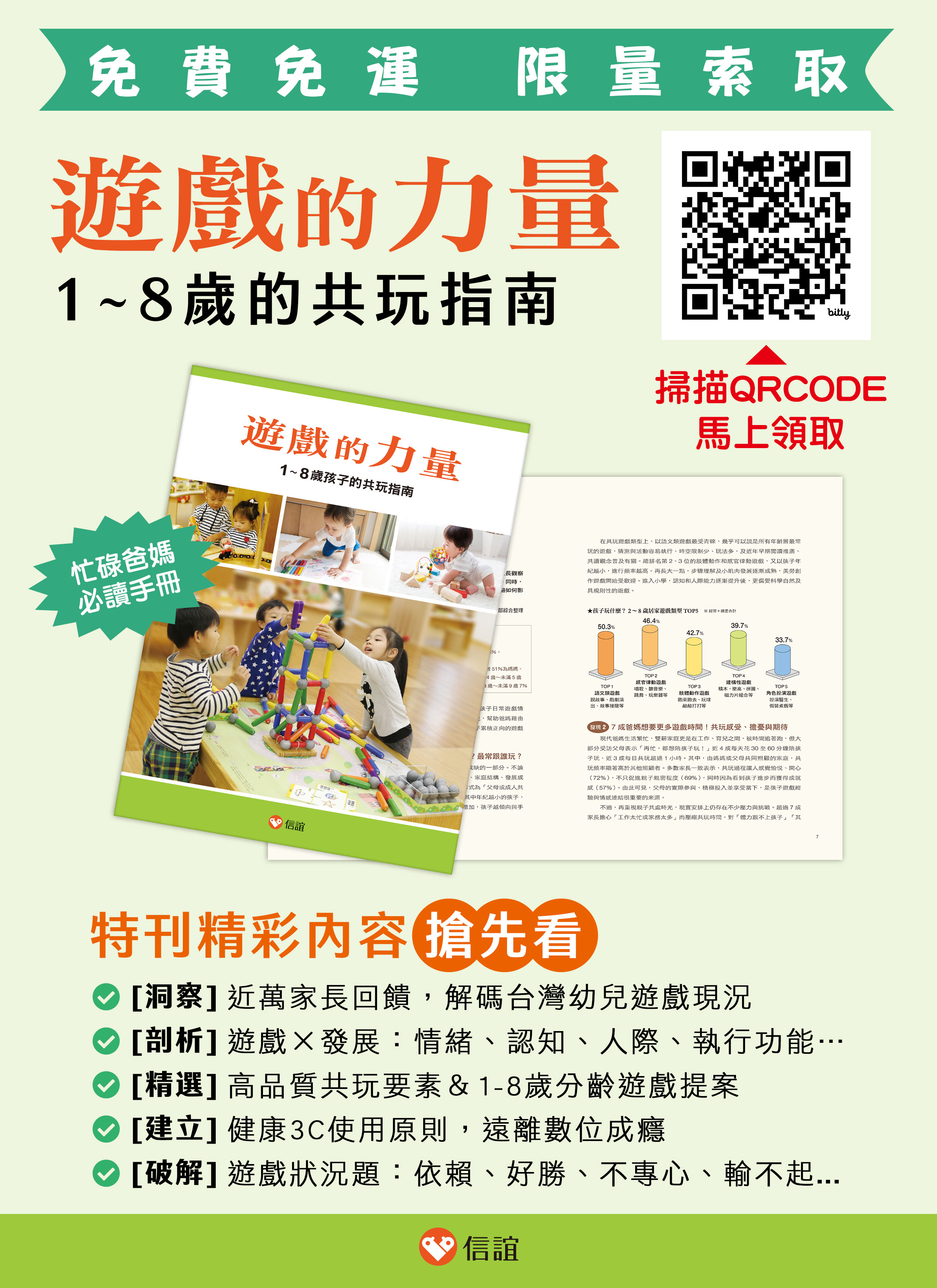 二、《遊戲的力量:1-8歲孩子的共玩指南》特刊以協助家長和照顧者提升共玩與互動的品質,讓孩子玩出成長關鍵力為主要目標,是現代父母提高遊戲效能、增加共玩靈感的必讀實用手冊。即日起,開放【免費免運索取】。