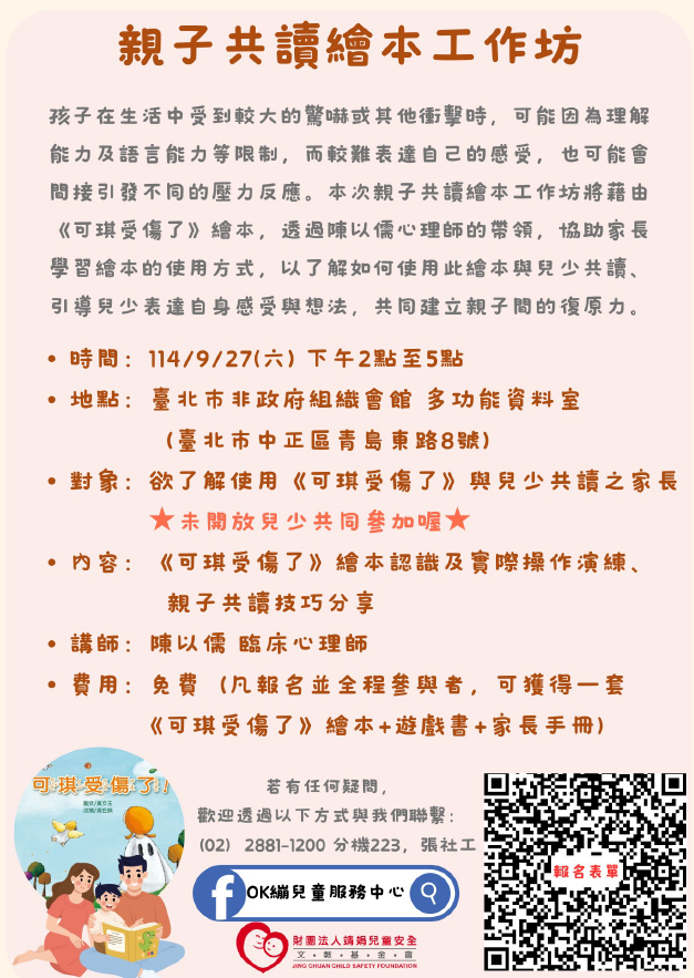 二、該會辦理親子共讀繪本工作坊,期待透過協助家長學習使用繪本的方式,以了解如何使用《可琪受傷了》此繪本與兒少共讀,共同建立親子間的復原力。