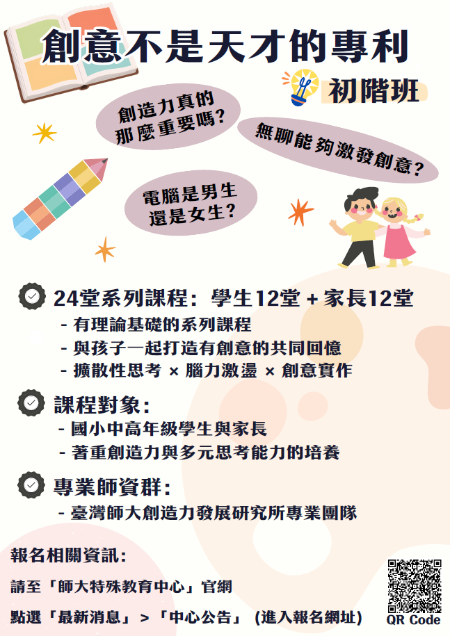 一、為促進國小學生創意思考能力與親子互動學習,本校特殊教育中心潛能開發中心辦理「114學年度第二學期推廣課程-國小組《創意不是天才的專利》」。
