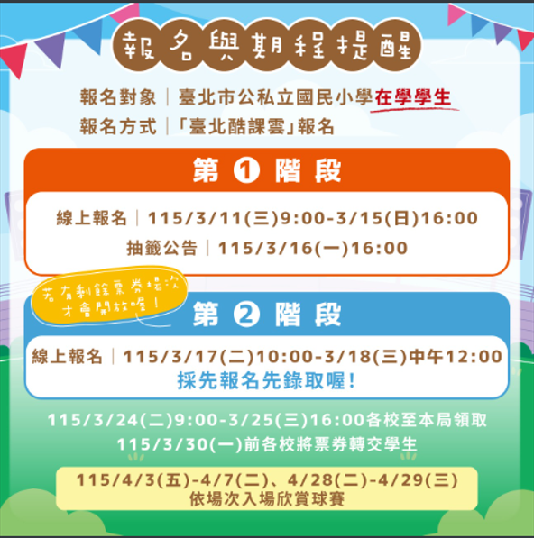 (二)場次:115年4月3日至4月7日、4月28日及4月29日,共計7場次,地點為臺北市立天母棒球場。