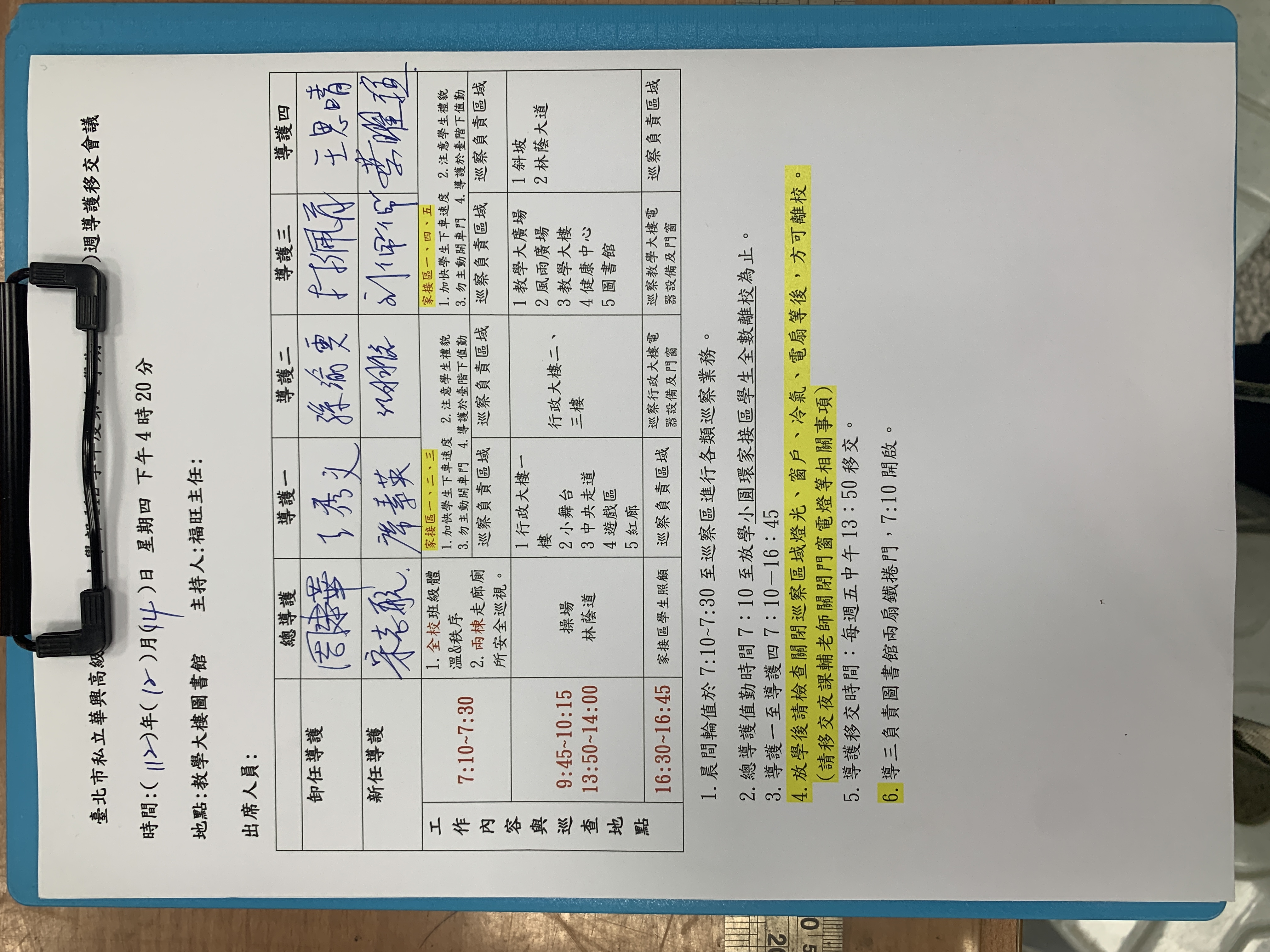 | 落實每周導護交接 | 導護執勤紀錄詳實 | 導護老師移交會議 |