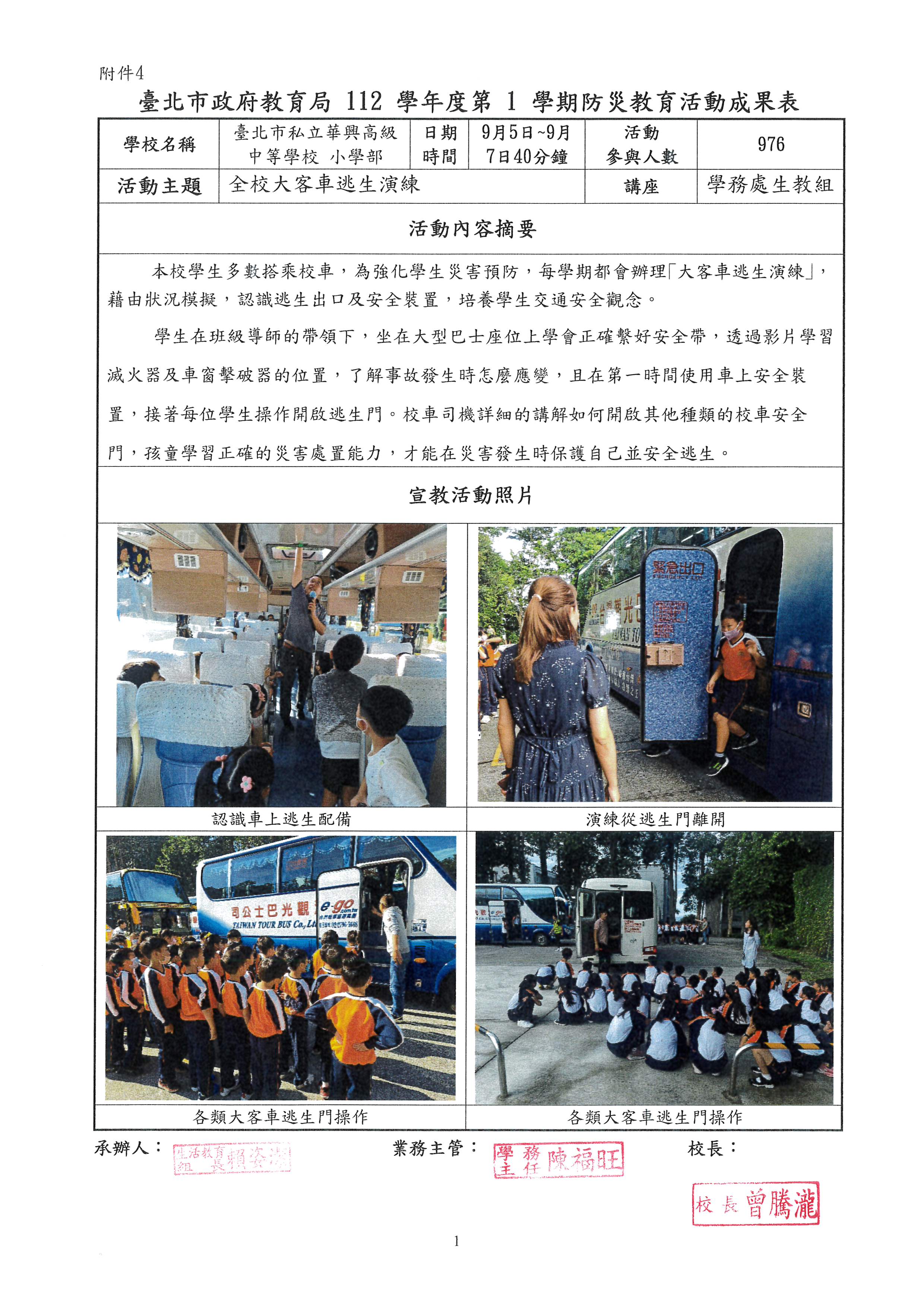 三、結合社區ego校車公司資源,112年9月5~9日辦理大客車逃生演練活動。