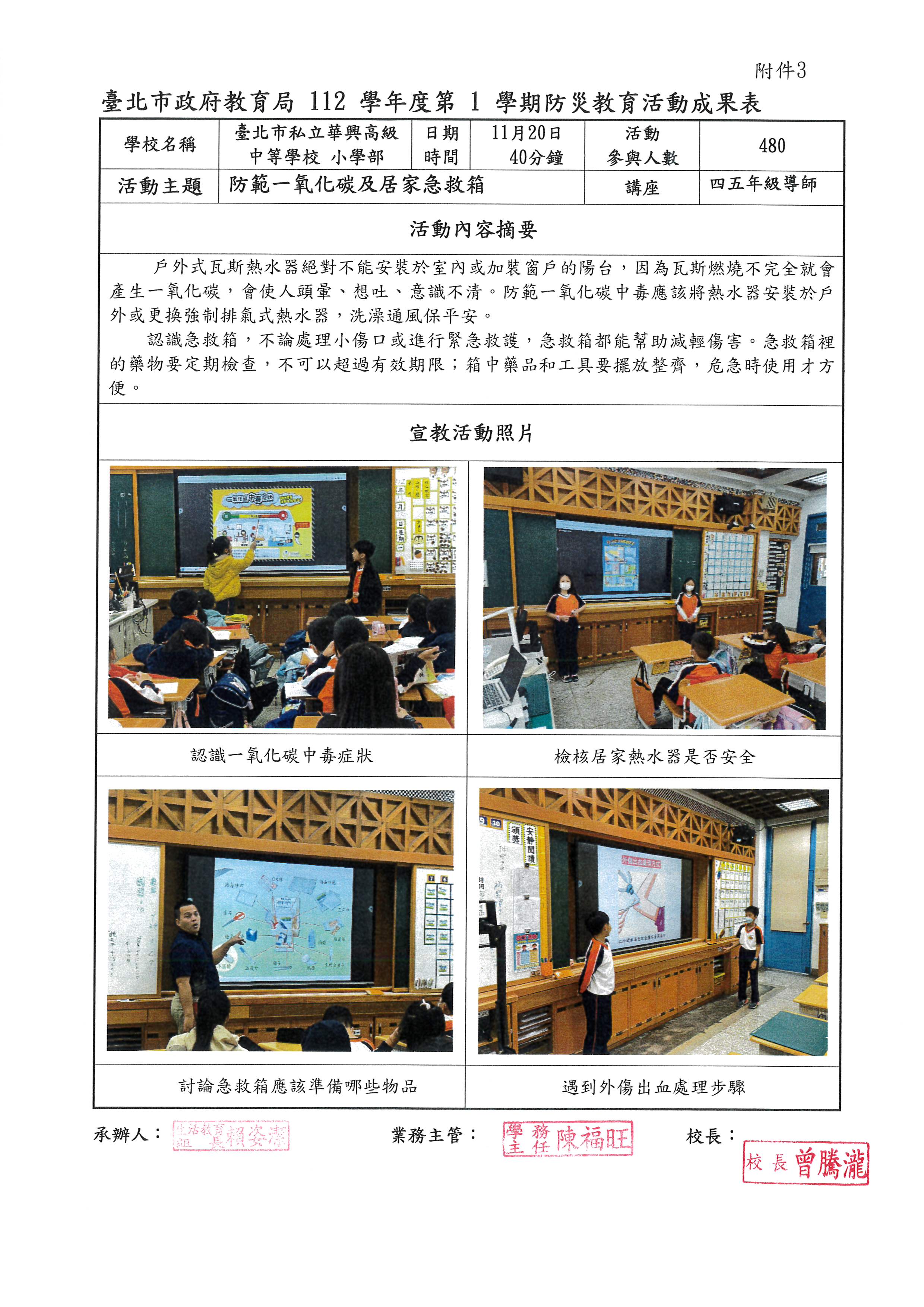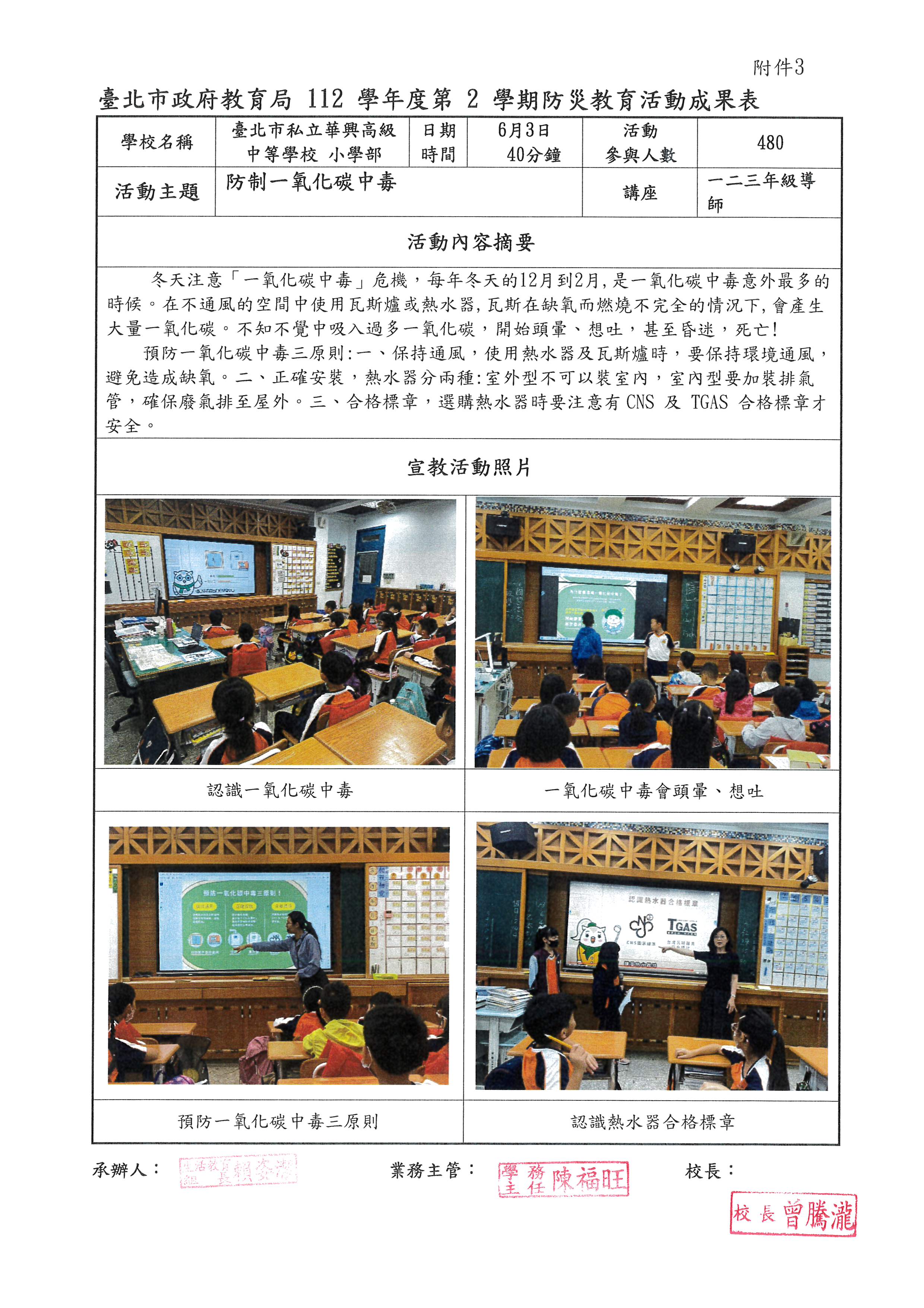 | 校園廣告機宣導一氧化碳中毒防範 | 校園網站公告相關防範一氧化碳中毒資訊 | 班會宣導防範一氧化碳中毒訊息 |
