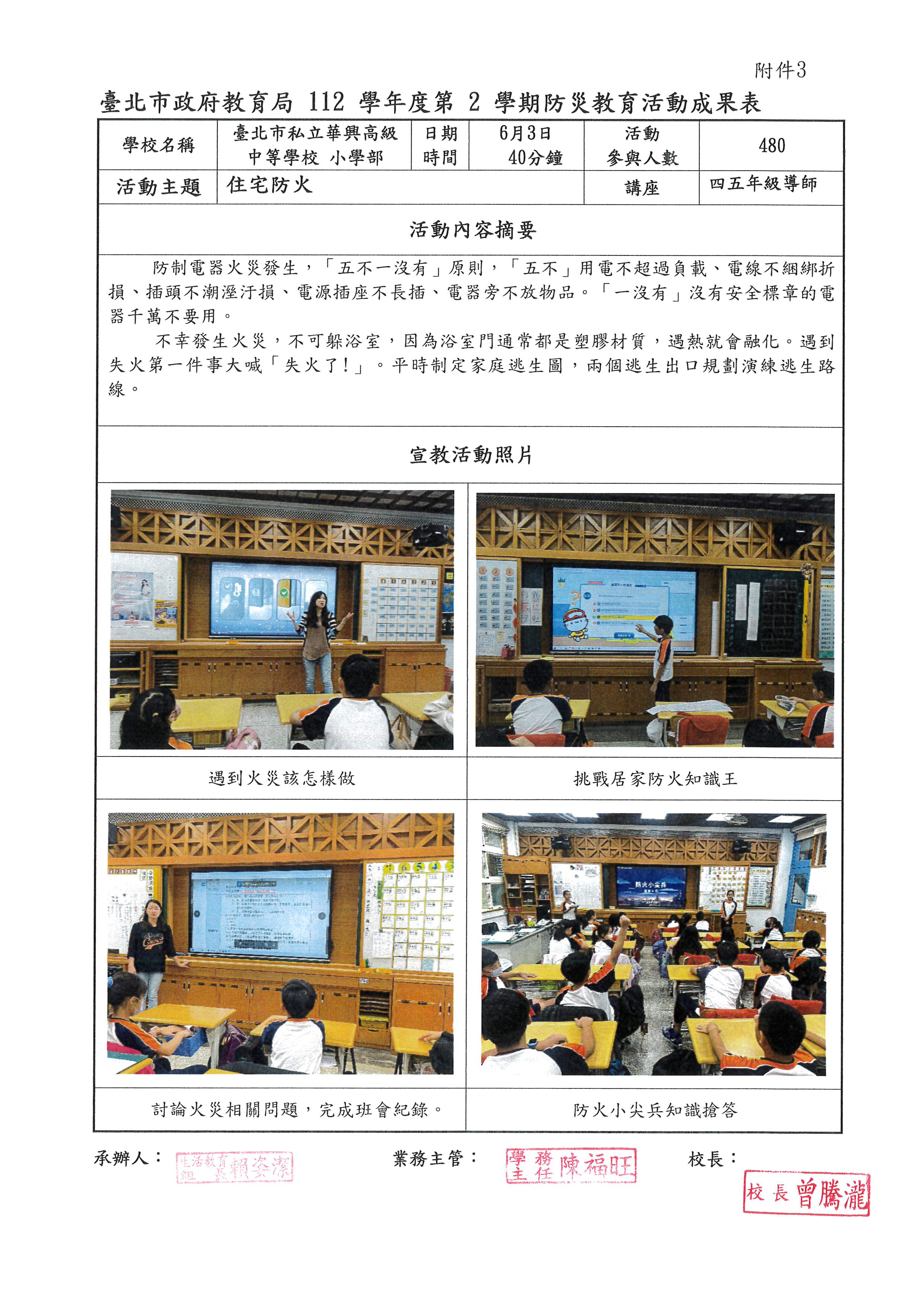 | 學校網站宣導住宅防火觀念 | 班會遇到火災該怎麼辦 | 防火小尖兵知識搶答 |