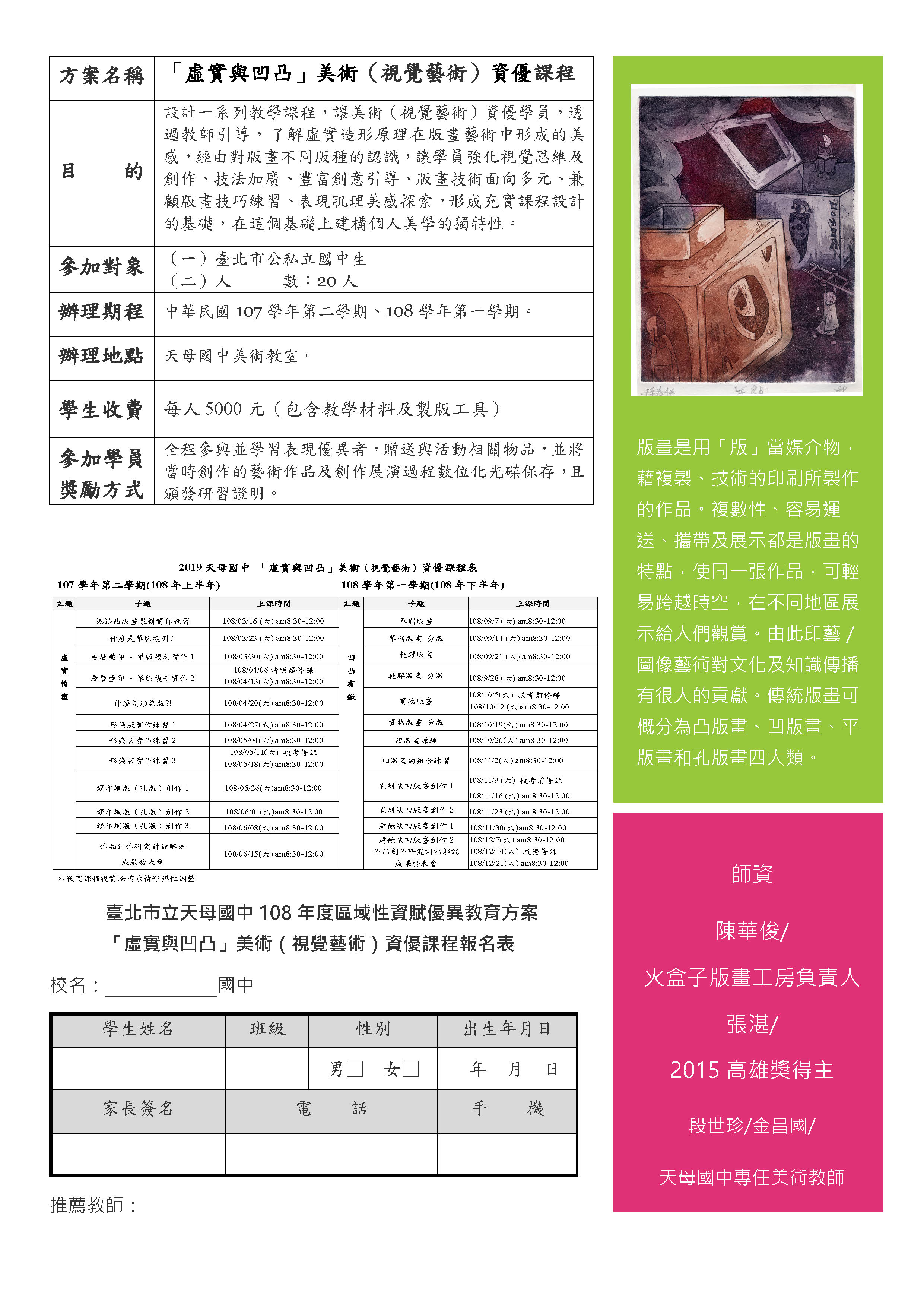 一、課程時程:108年3月16日(六)至12月21日(六)止,每週六上午8時30分至12時。 二、課程地點:臺北市立天母國民中學(11153 台北市士林區天母東路120號)。 三、報名方式:請學生於108年2月27日前向本校輔導室蔡欣耘老師報名。 四、實施計畫及相關報名表件請參考附件檔案。