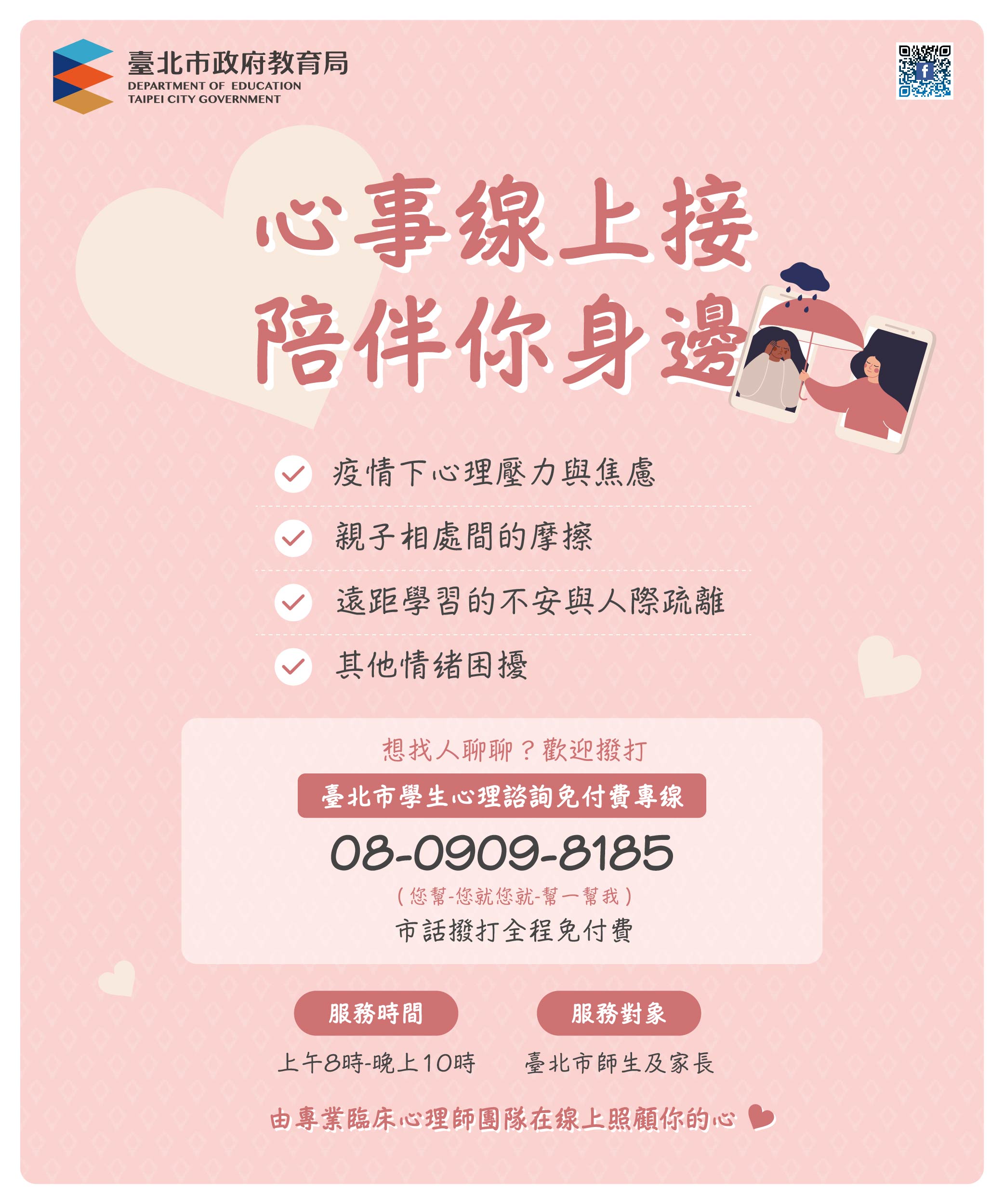 臺北市政府教育局設置「臺北市學生心理諮詢免付費專線」自即日起正式上線