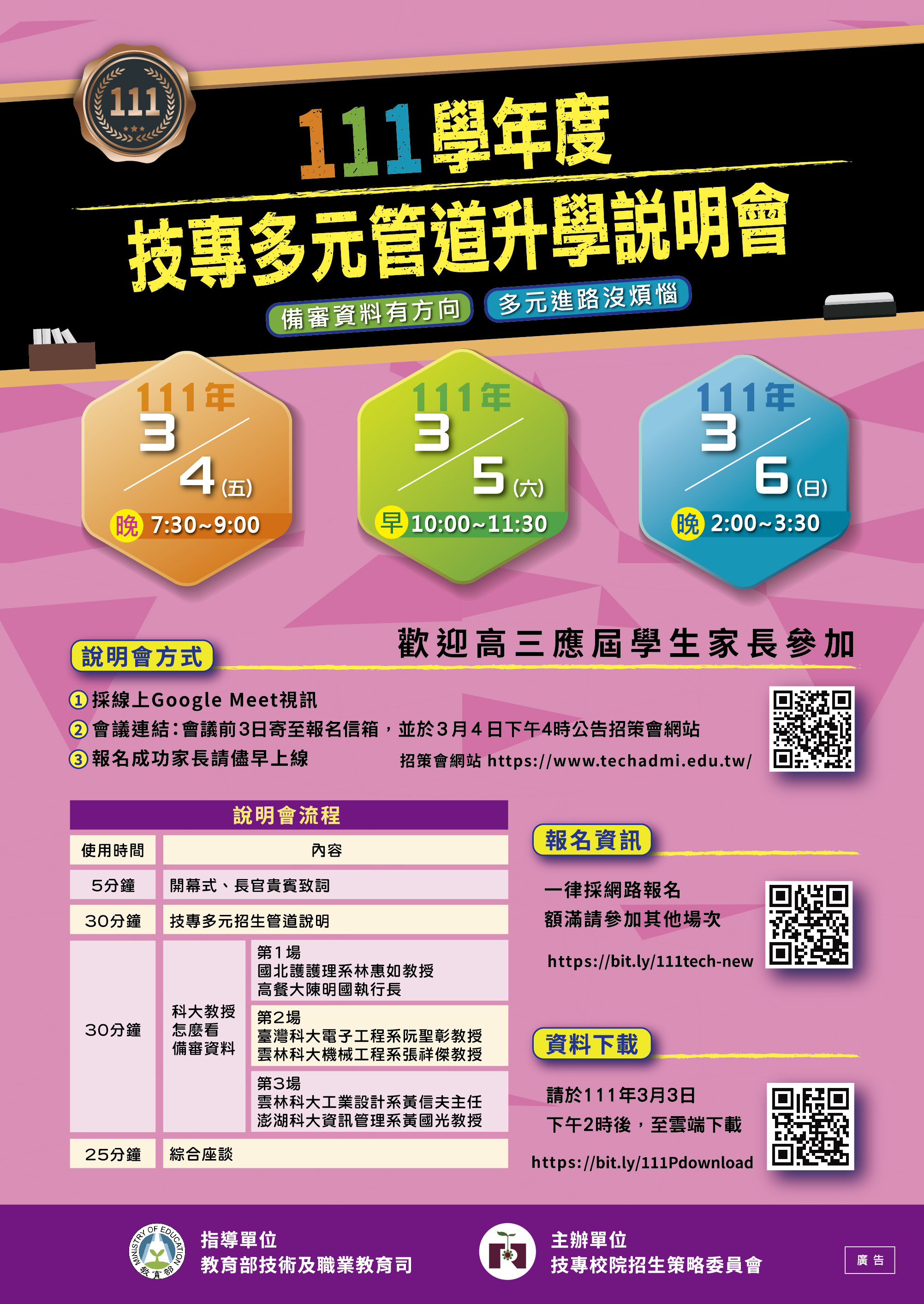 技專校院招生策略委員會為協助即將升學技專校院之親師生瞭解111學年度四技二專升學資訊,邀請技專教授、專家學者說明多元入學管道的特性與重要時程、招生參採學習歷程檔案的重點說明,以及科大教授怎麼看備審資料,並與教師及家長學生進行意見交流。