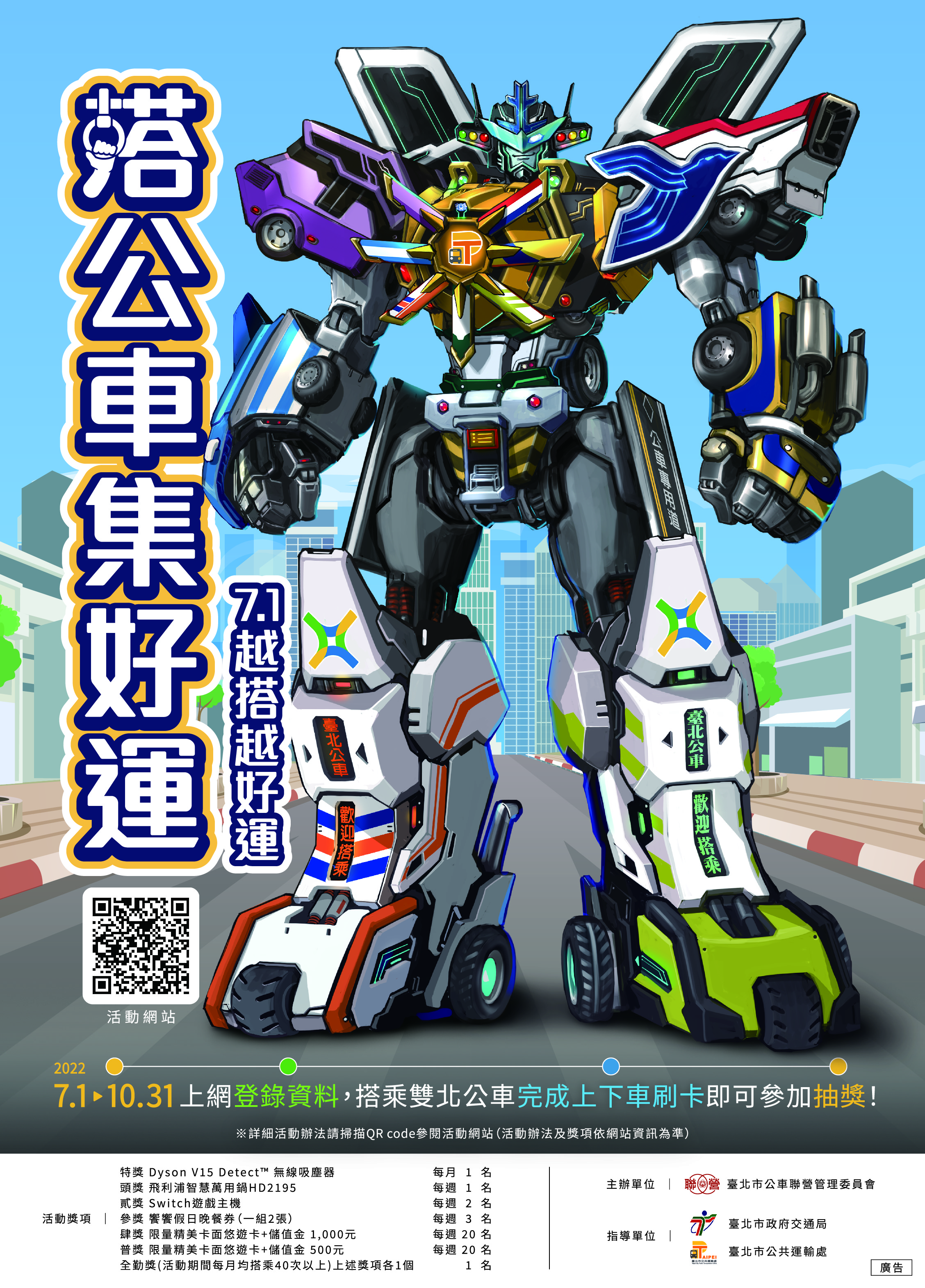 臺北市公共運輸處為持續鼓勵民眾搭乘公車,凡於臺北市公共運輸處網頁活動網頁登錄基本資料及悠遊卡卡號,在111年7月1日至10月31日期間搭乘雙北市市區公車,並使用悠遊卡完成上下車刷卡即可獲得抽獎機會,搭乘次數越多中獎機會越大。