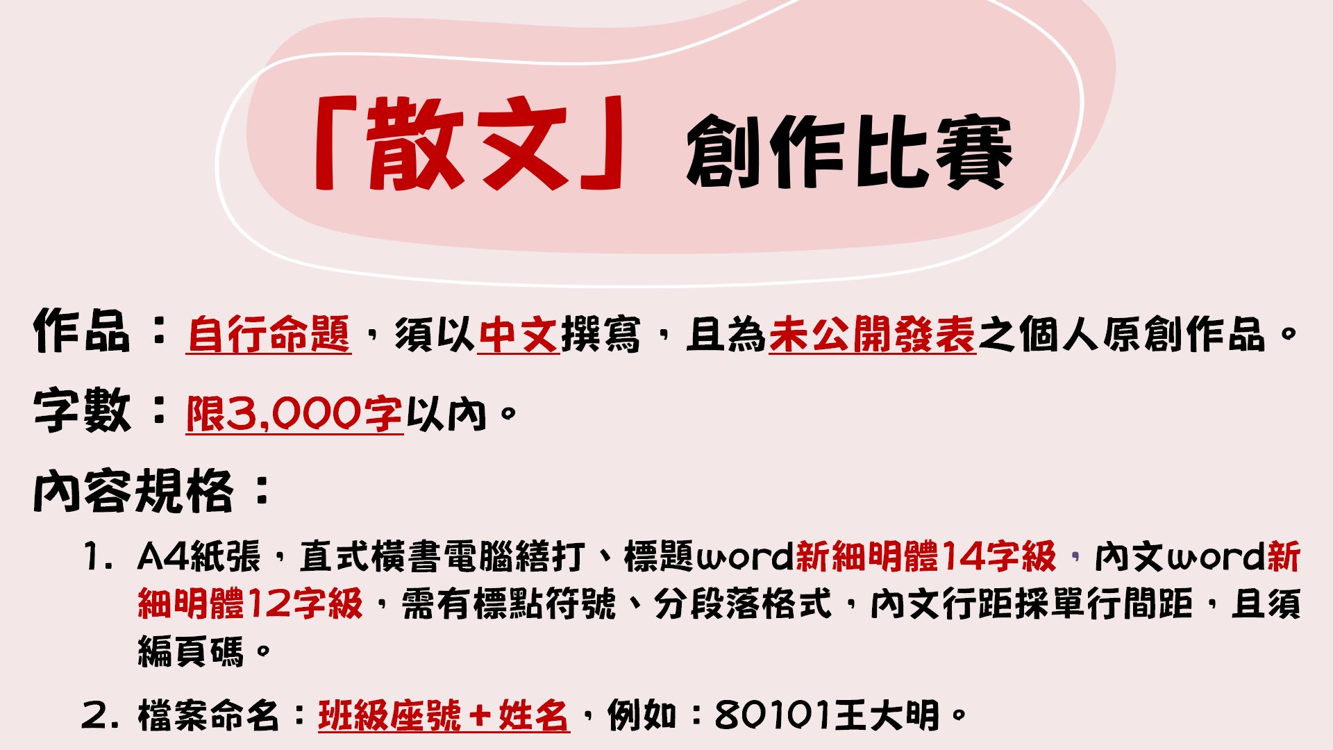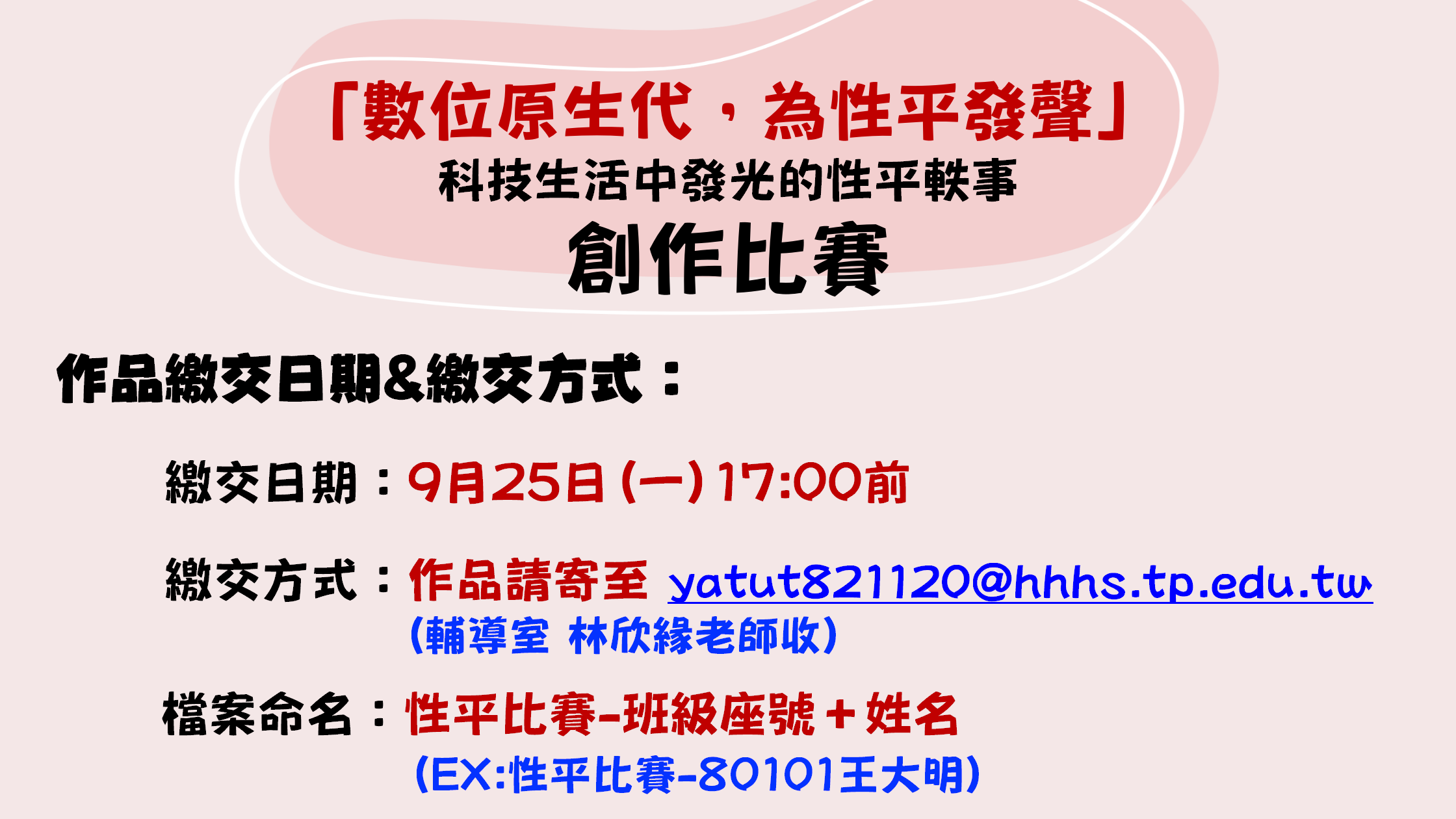 作品繳交方式:請寄至 yatut821120@hhhs.tp.edu.tw (輔導室 林欣緣老師收)