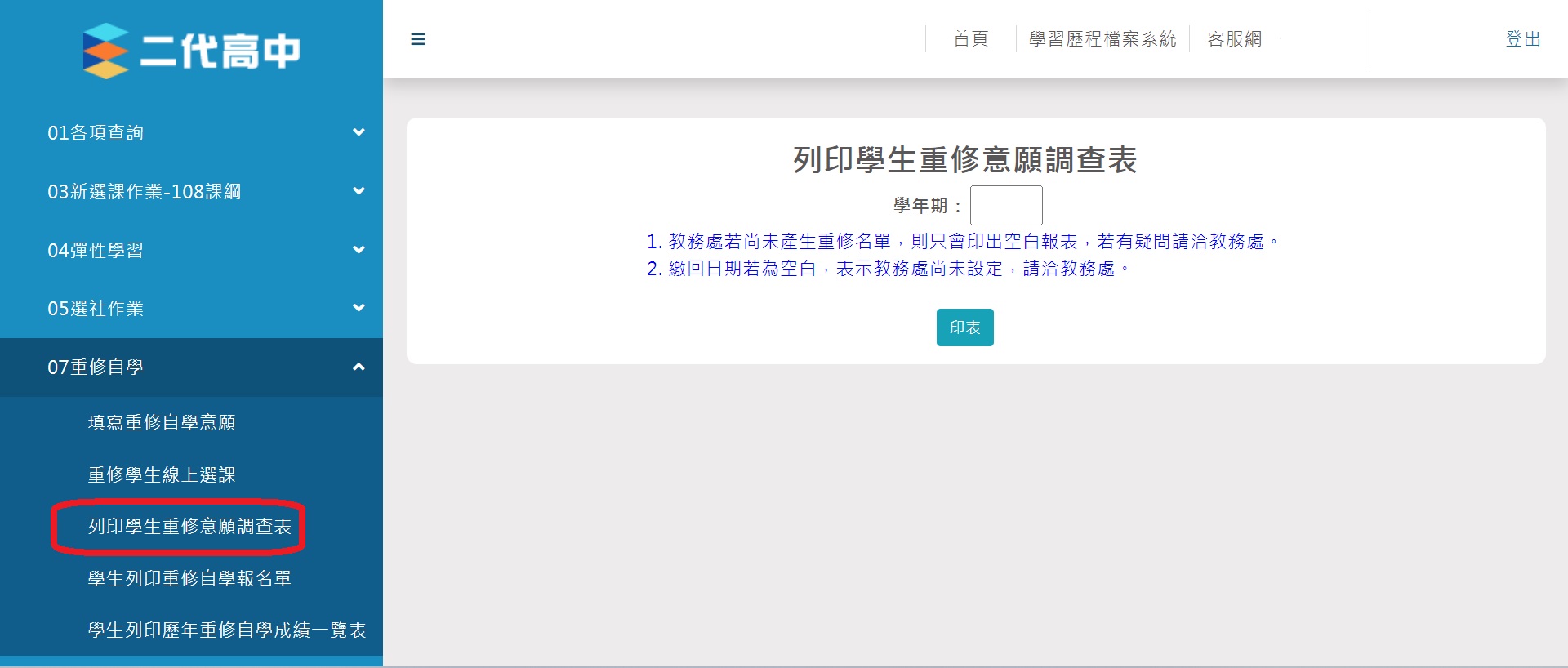 備註:查詢可重修科目→上高中二代校務行政系統→07重修自學→列印學生重修意願調查表→輸入學年期1122→印表