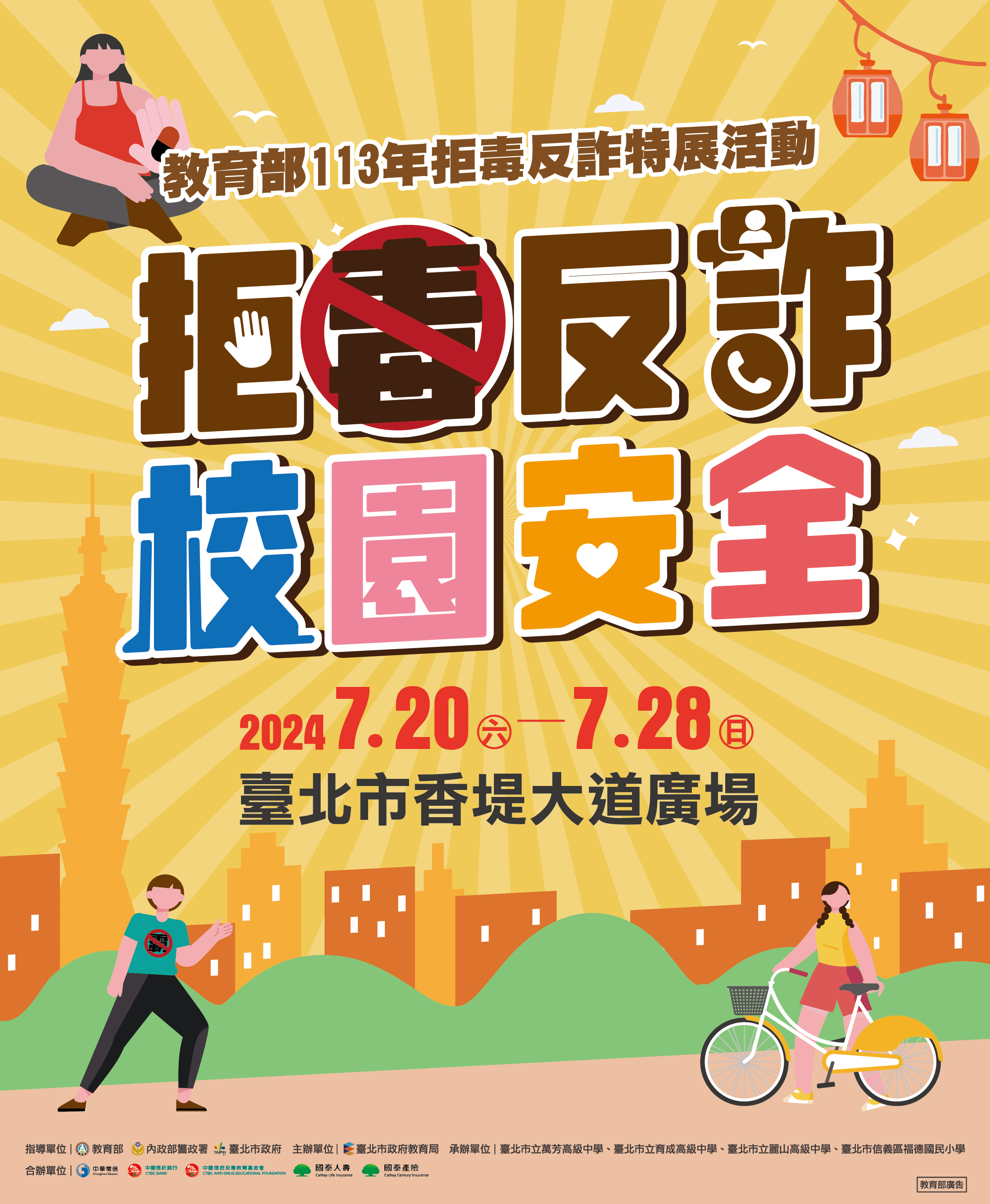 教育部與臺北市政府於7月20日(六)至7月28日(日)在信義香堤廣場舉辦教育部113年拒毒反詐特展活動,今年結合反毒、反詐、反霸凌與交通安全,邊學邊玩邊闖關,有機會獲得限量禮品哦!