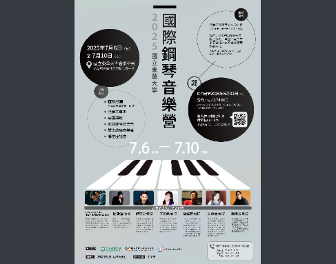 說明:一、本校音樂學系於114年7月6日至114年7月10日舉辦「2025國立東華大學國際鋼琴音樂營」,由于汶蕙教授執行策劃;特別邀請國外Roman Zaslavsky羅曼·扎斯拉夫斯基、謝承峯教授與國內盧易之、曾增譯、陳欣宜、魏廣晧、于汶蕙教授講座、一對一教學、教授大師班與教授音樂會演出,敬請協助宣傳,期待師生踴躍報名參加。二、相關資訊請至本校音樂系網站查詢(https://reurl.cc/QYL4rO)