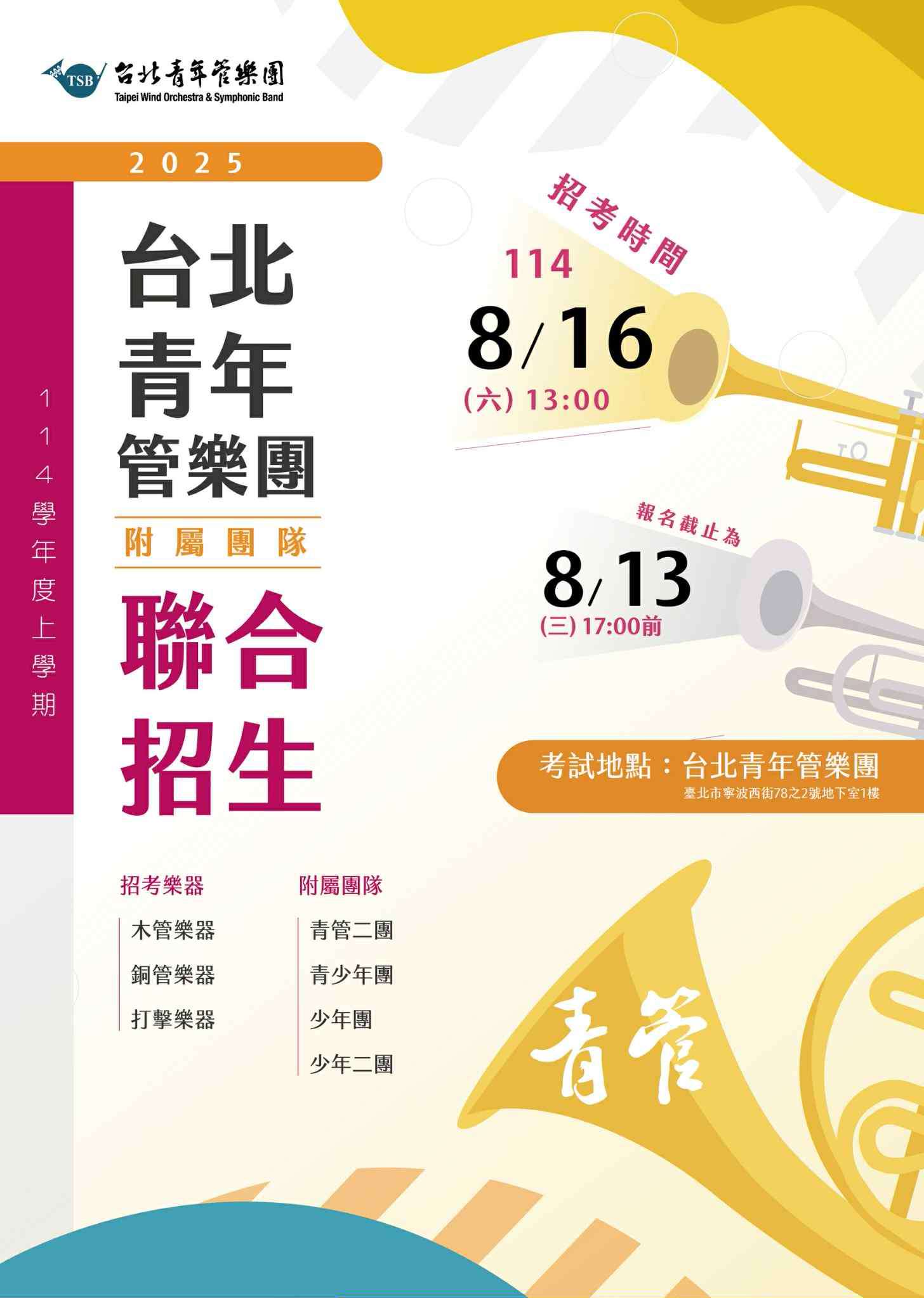 (三)考試簡章與報名請見連結 (https://reurl.cc/V0XOMN);相關問題請逕洽台北青管教學主任林老師(02-2322-3654)。(四)相關招生資訊請至台北青年管樂團臉書粉絲專頁查詢(https://www.facebook.com/tsbgroup/)。