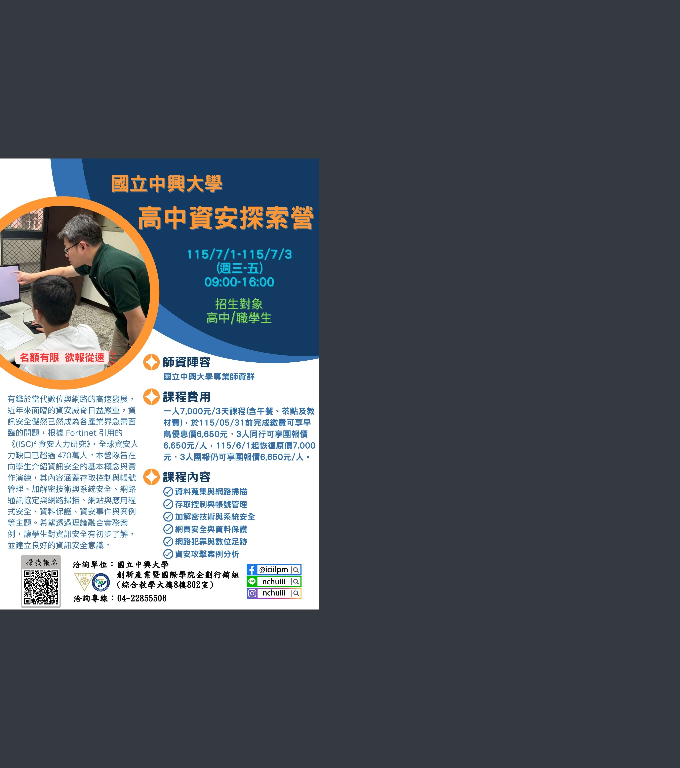 三、報名期間:即日起至額滿截止(周一至周五09:00-17:00),僅招收一梯次30位學生。